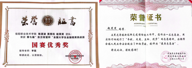 获奖情况:“国家励志奖学金”“校级奖学金”“第二届全国高等院校财务数智化大赛二等奖”“第一届河南省YonBIP商业创新大赛——财务数据赛项特等奖”“2020年社会实践先进个人”“优秀学生干部”等