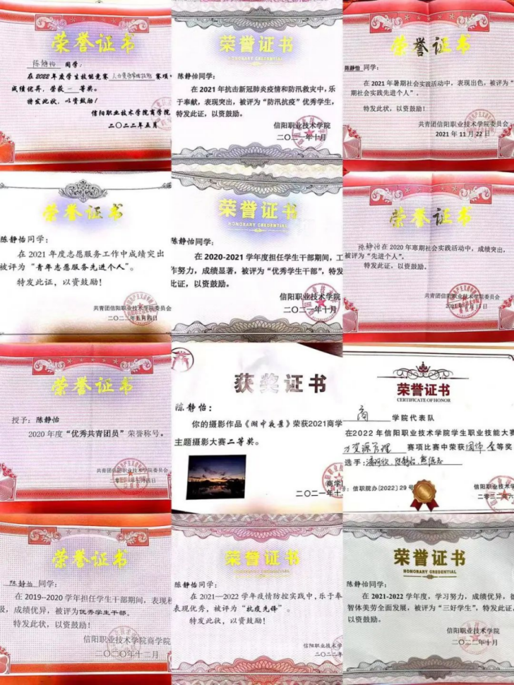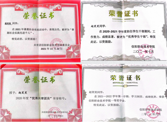 获奖情况:“河南省优秀共青团员”“河南省优秀学生干部” “信阳市优秀共青团员” “魅力团支书” “三好学生”“优秀共青团干部”“社会实践先进个人”等