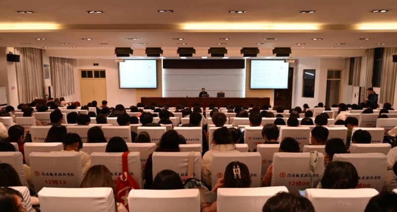 在讲座中,邱学明从“我眼中的电商”、“信阳电商浪花”、“如何面对电商”三个方面分析了电子商务行业的当前发展状况和广阔的就业前景,介绍了信阳电商小镇的背景、直播电商发展情况和光山现象,探讨了电商领域的核心本质,并分享了关于就业创业的宝贵建议。最后,他希望同学们无论从事任何行业都要遵纪守法、服务产业、服务社会、服务国家、服务时代。报告厅座无虚席,掌声常响。整场讲座通俗易懂,富有幽默感,结合真实的行业案例,让在座的师生都受益匪浅。