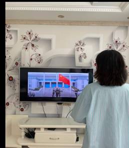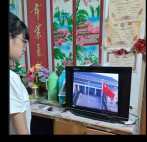 七点三十分师生面对直播视频中的五星红旗行注目礼,看着五星红旗冉冉升起,内心无比激动。随后,各班入党积极分子优秀代表带领大家再一次面向团旗重温誓词,最后升旗仪式在嘹亮的团歌中结束。