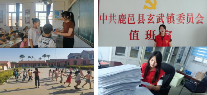 时晨雨同学在周口市鹿邑县玄武镇时口村时口小学参与支教,在支教时朝气蓬勃的孩子们总能带给她活力与乐趣。支教工作结束后她又报名“返家乡”活动,在玄武镇人民政府党政办公室参加志愿服务工作,并在疫情严重期间主动在防控站点进行核酸检测采集,这段时间让她觉得忙碌且充实。深入基层,能从中学习到很多书本上学不到的东西。也为以后更好地参与工作奠定了基础。她将继续履践致远。有一份热发一份光,不啻微芒,火炬成阳。